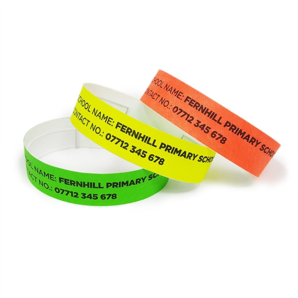 Nowadays, purchasing personalised wristbands for school trips has never been easier and more inexpensive. By ordering in advance, you can ensure that the children will be easily identified, and your school quickly contacted. Younger students might not be able to memorise their parents’ phone numbers or address, therefore making wristbands a more cost-effective and reliable alternative. You can use one of our pre-printed bands or customise your own.