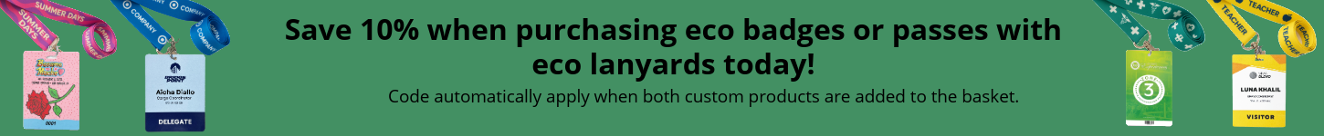 We offer a range of eco friendly event badges such as our 100% waterproof recyclable passes printed in the UK using a CO2 neutral printing press to reduce the effect on the environment. These passes can be hole punched and attached to an eco lanyard. Alternatively you can opt for paper event passes made out of card materials that can be recycled at your local recycling centre. These can also be printed using environmentally friendly printing systems and personalised with the name of the attendees.